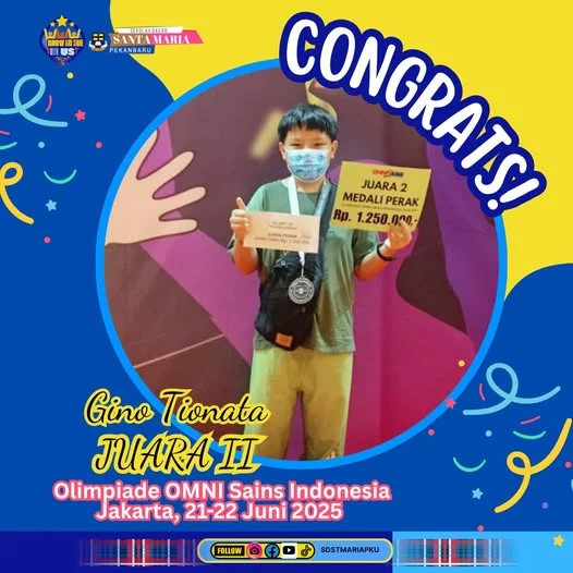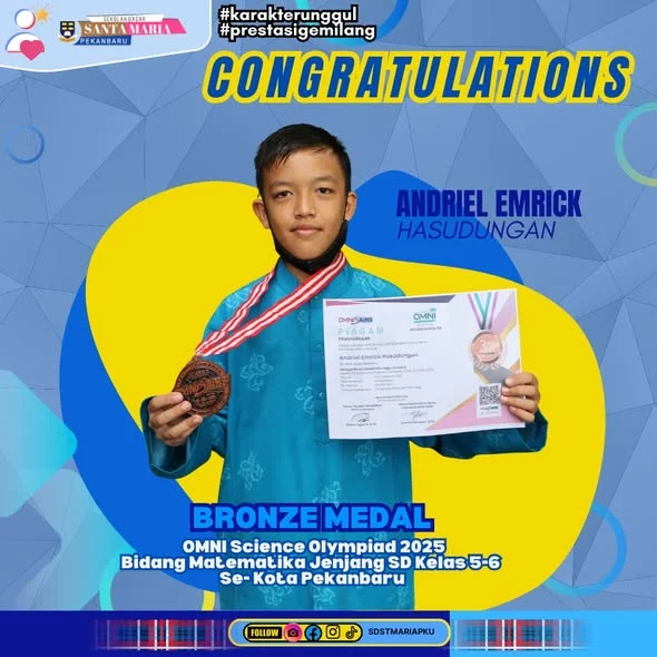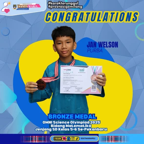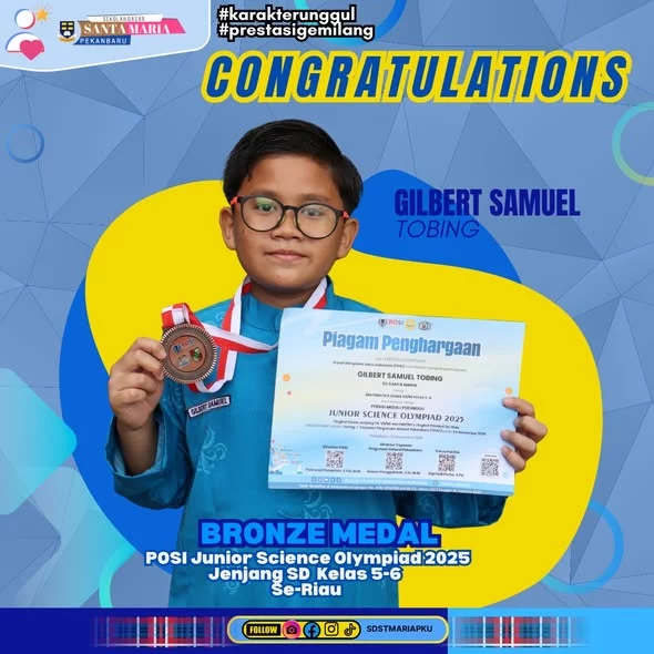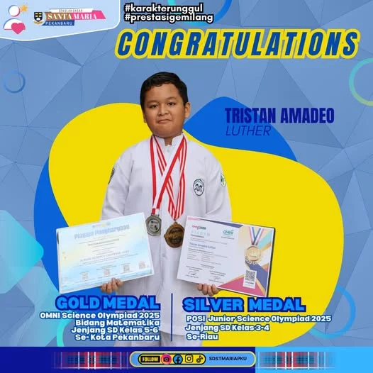 ![]() | Tristan Amadeo Luther | Gold Medal Science Olympiad 2025 Bidang Matematika, Jenjang SD Kelas 5–6 Se-Kota Pekanbaru Silver Medal Junior Science Olympiad 2025 Jenjang SD Kelas 3–4 Se-Riau | OMNI dan POSI | Kota dan Provinsi | 2026/1 |