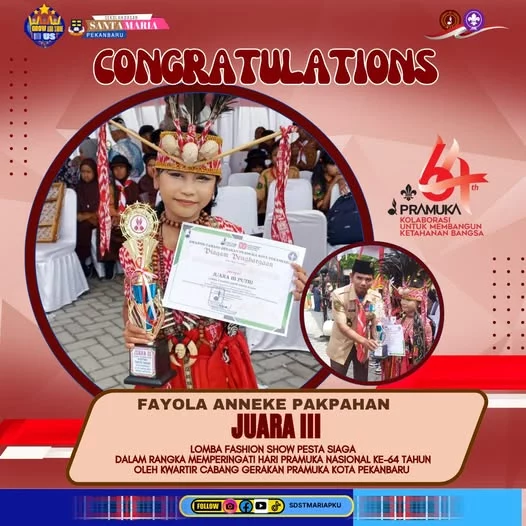 ![]() | Fayola Anneke | Juara III Lomba Fashion Show Pesta Siaga Hari Pramuka Nasional ke-64 Tahun | Kwartir Cabang Gerakan Pramuka Kota Pekanbaru | Kota | 2025/8 |