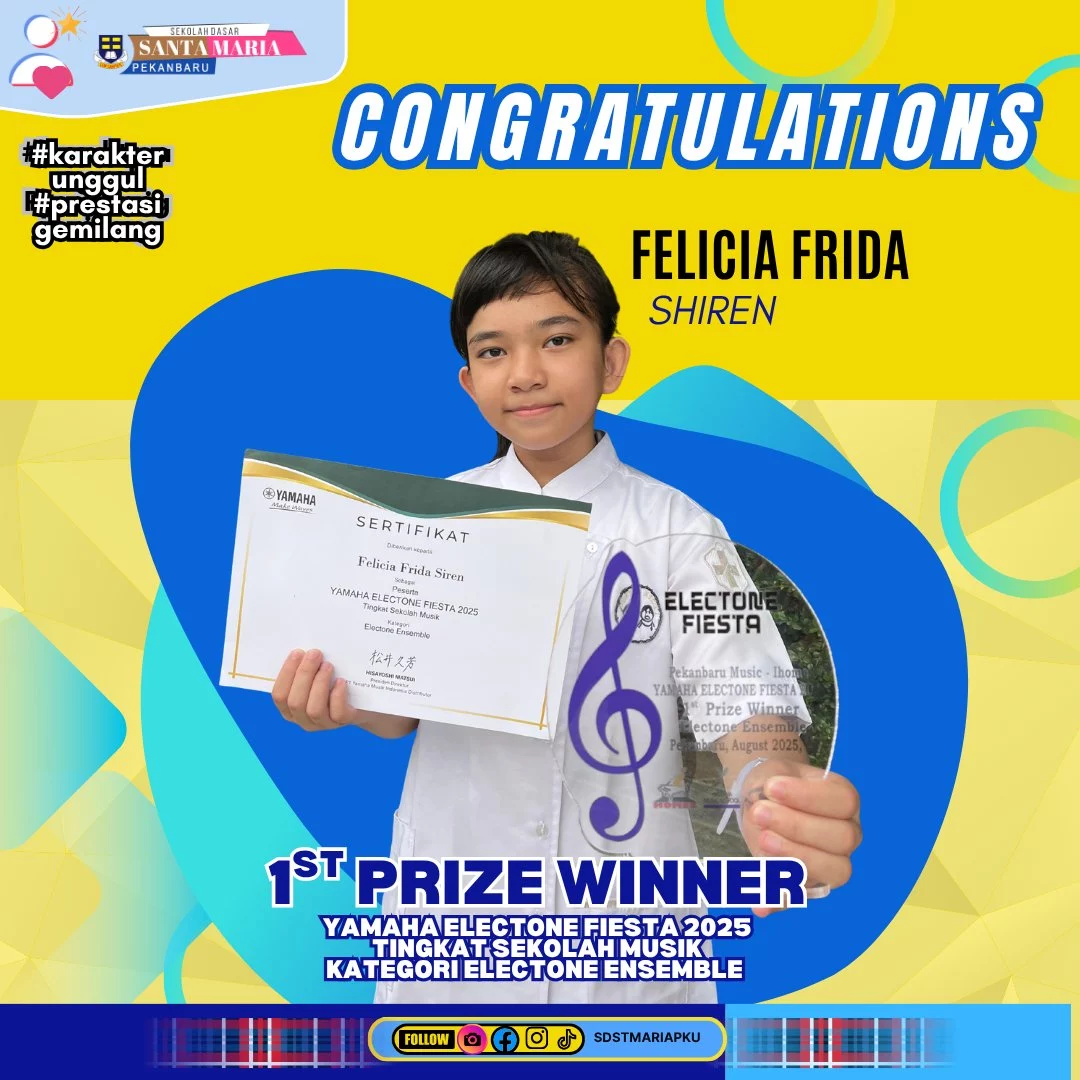 ![]() | Felicia Frida Shiren | 1st Prize – Electone Fiesta 2025 2nd Prize – Electone Ensemble Tingkat Wilayah | Sekolah Musik Yamaha | Provinsi | 2025/11 |