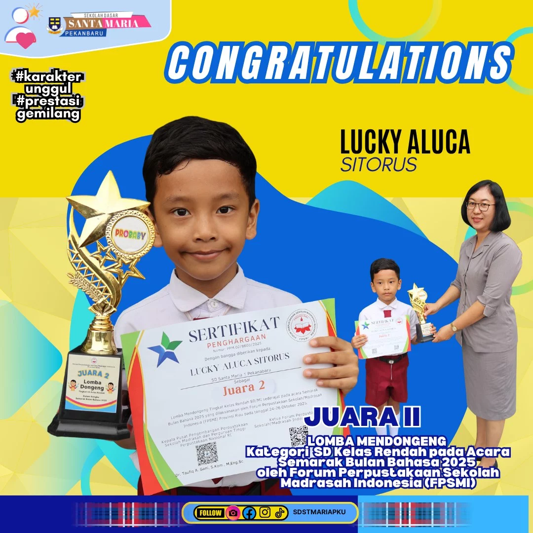 ![]() | Lucky Aluca Sitorus | JUARA II Kategori SD Kelas Rendah Lomba Mendongeng di Pameran Pendidikan Gebyar Sahabat Anak Aman dan Semarak Bulan Bahasa | Forum Perpustakaan Sekolah Madrasah Indonesia (FPSMI | Kota | 2025/10 |