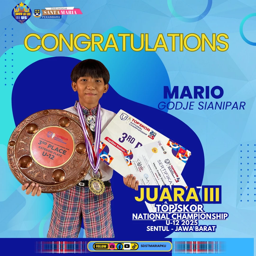 ![]() | Mario Godje Sianipar | Juara 3 kategori Plate U-12 | TOP SKOR National Championship | Nasional | 2025/9 |