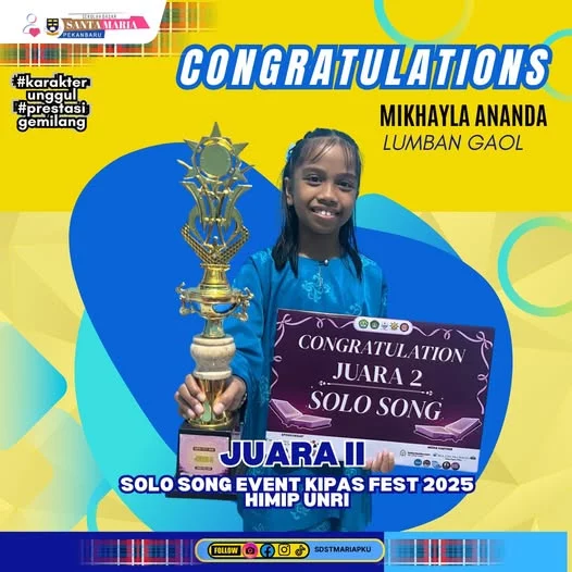 ![]() | Mikha Rotua Chaterine Silalahi | JUARA 1 Kontes Menyanyi Usia 4-10 Tahun Dalam Rangka Hari Batik Nasional | Dinas Pendidikan Kota Pekanbaru | Kota | 2025/10 |