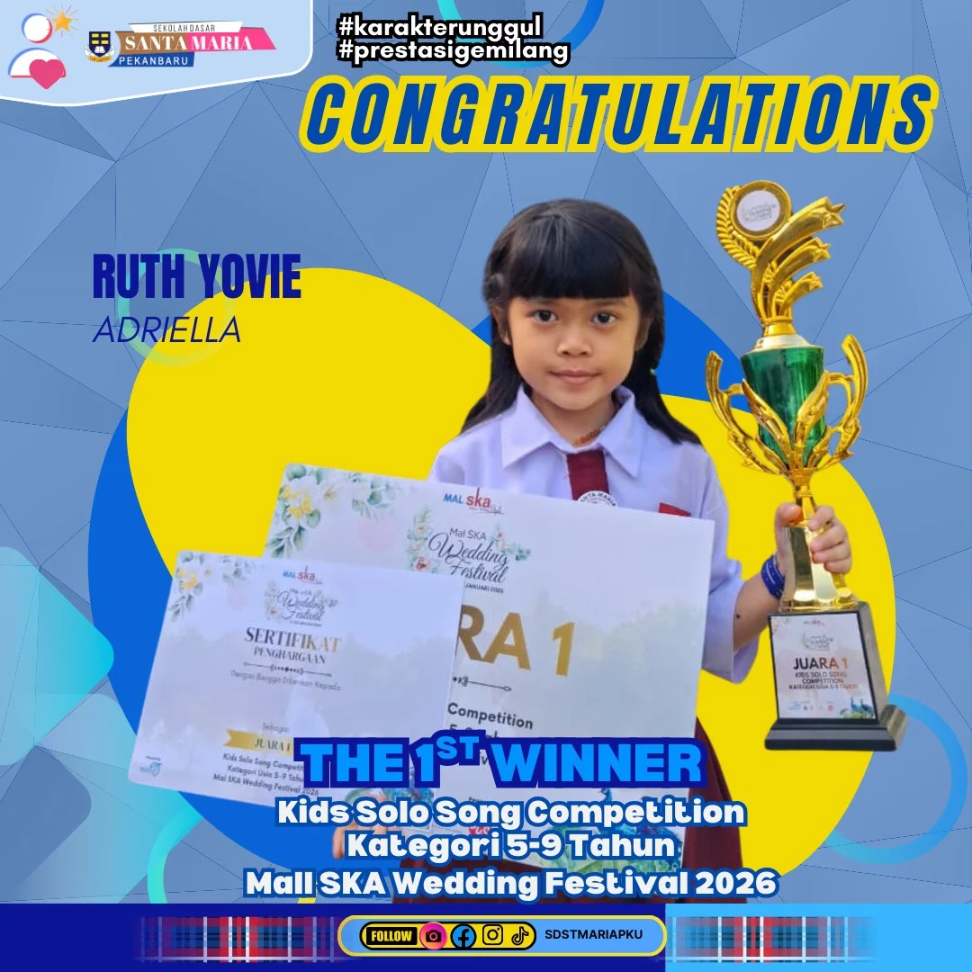 ![]() | Ruth Yovie Adriella | 1st Winner – Kids Solo Song Competition Kategori 5–9 Tahun 1st Winner – Solo Vocal Kids Competition | Mall SKA dan TIAM STUDIO | Kota | 2026/1 |