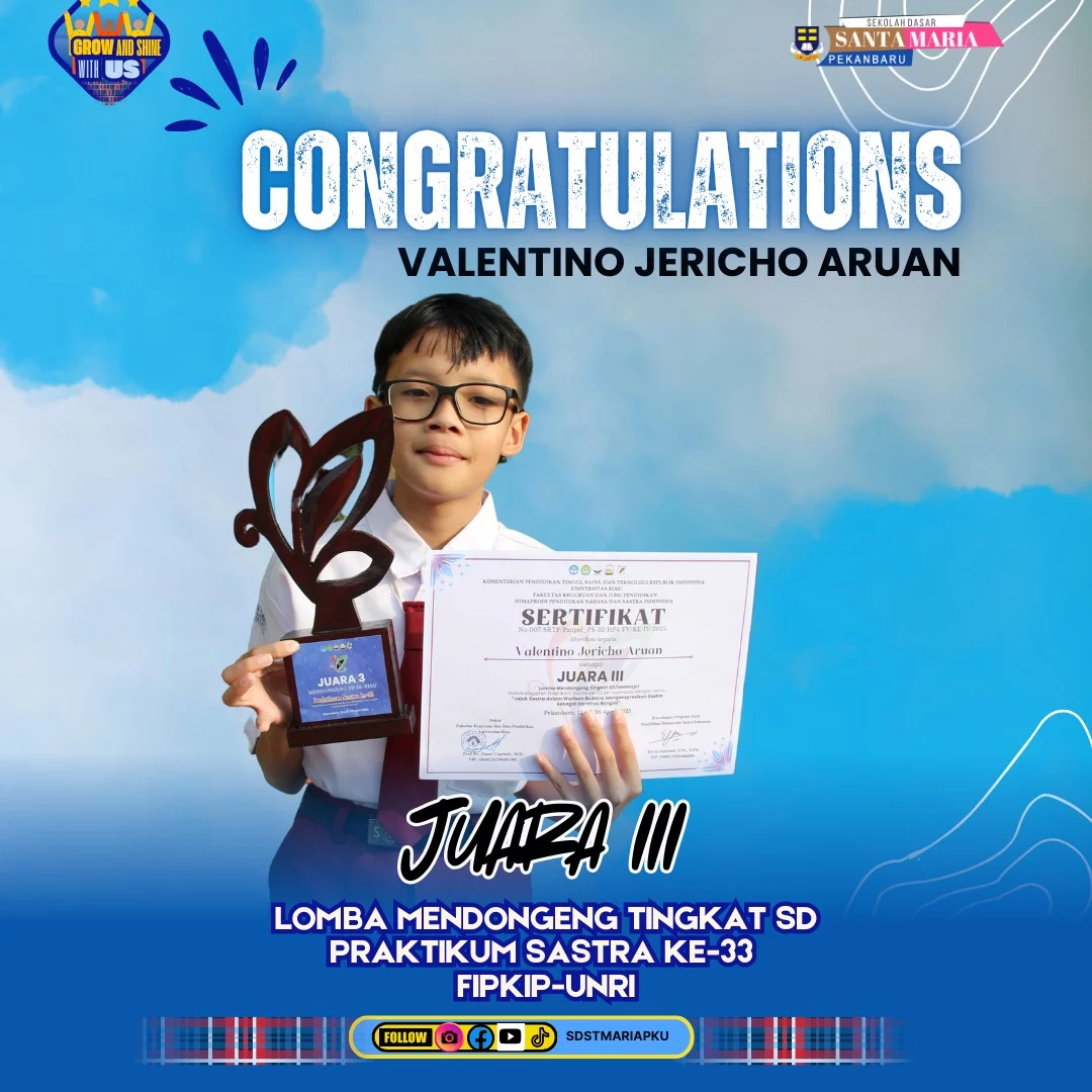 ![]() | Valentino Jericho Aruan | Juara 1 Lomba Mendongeng | Forum Perpustakaan Sekolah Riau | Provinsi | 2023 |