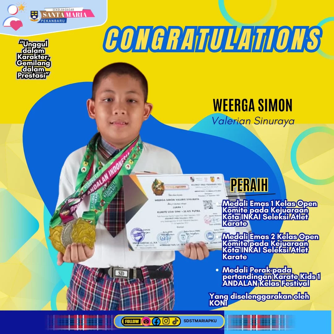 ![]() | Weerga Simon Valerian Sinuraya | Medali Emas 1 Kelas Open Komite pada Kejuaraan Kota INKAI Seleksi Atlet Karate Medali Emas 2 Kelas Open Komite pada Kejuaraan Kota INKAI Seleksi Atlet Karate Medali Perak pada pertandingan Karate Kids 1 ANDALAN Kelas Festival yang diselenggarakan oleh KONI. | KONI | Kota | 2025/10 |